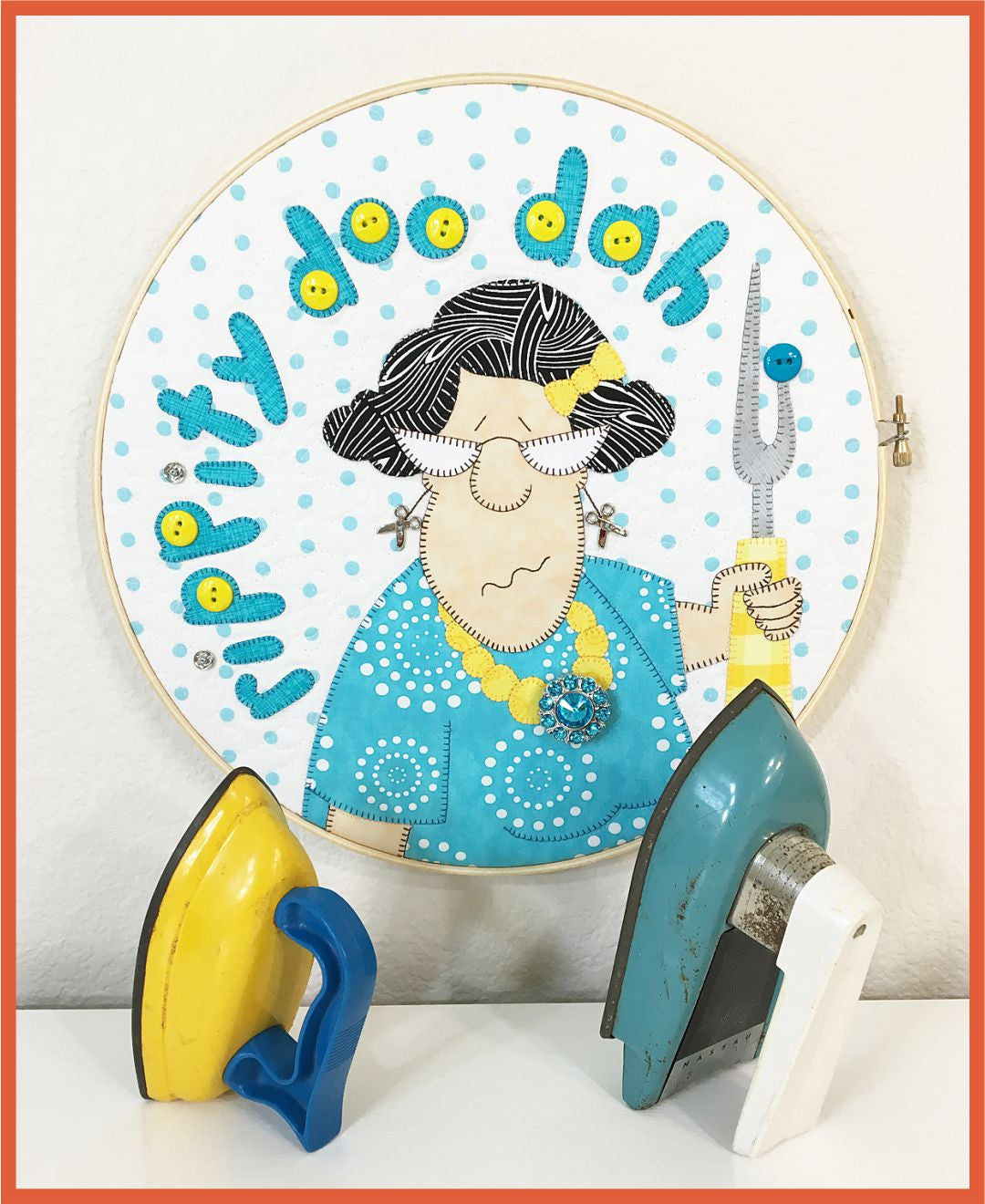 Rippity Doo Dah Quilt Pattern includes full size patterns, placement sheet, and instructions to make a 12 1/2" x 12 1/2" wall hanging, a tote bag, a 14" x 14" pillow, and a 12" hoop wall hanging. The technique is fusible appliqué.