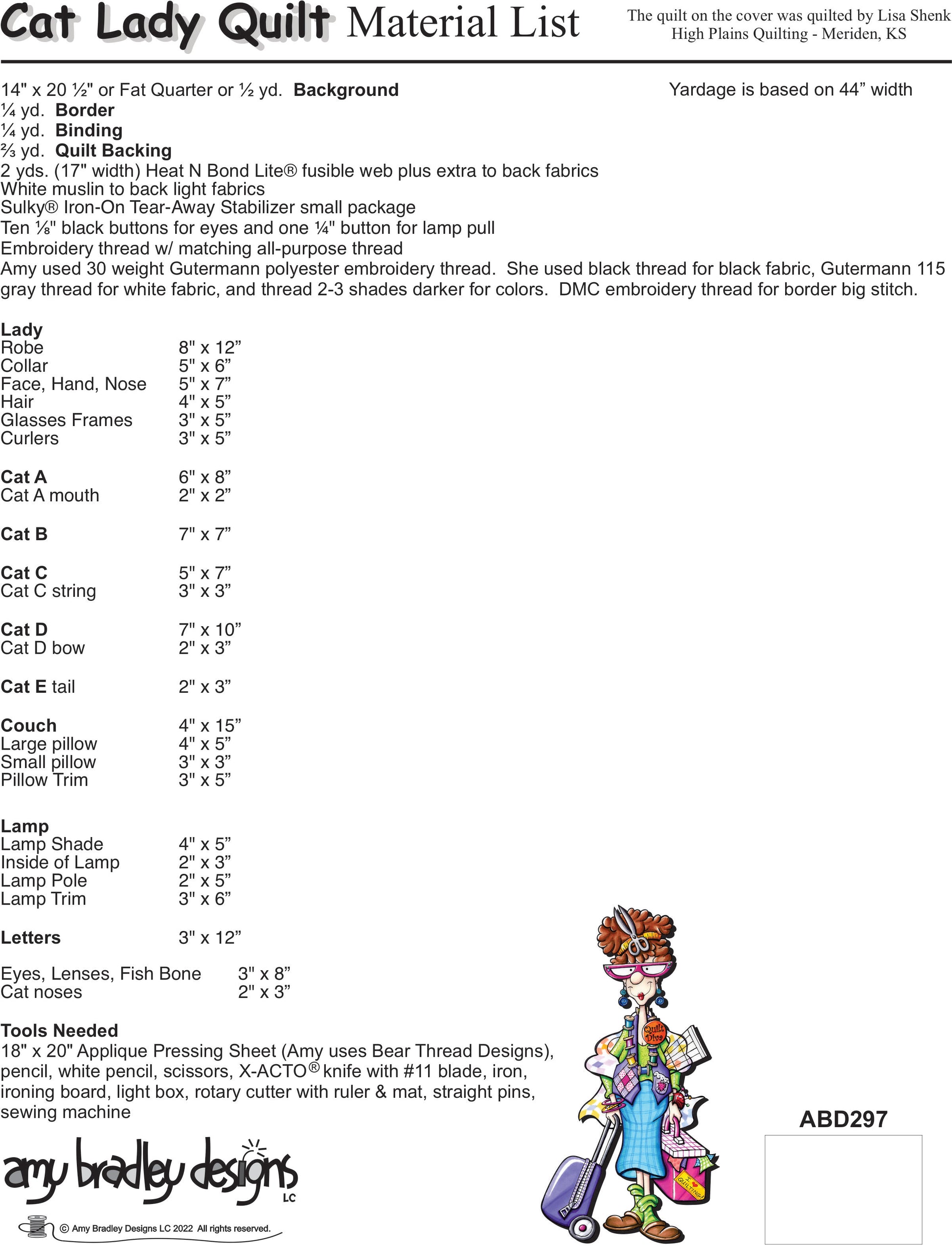 Cat Lady quilt pattern includes instructions with photos, full size patterns, and placement sheet to make this 19 1/2" x 25 1/2" quilt. The technique is fusible applique.