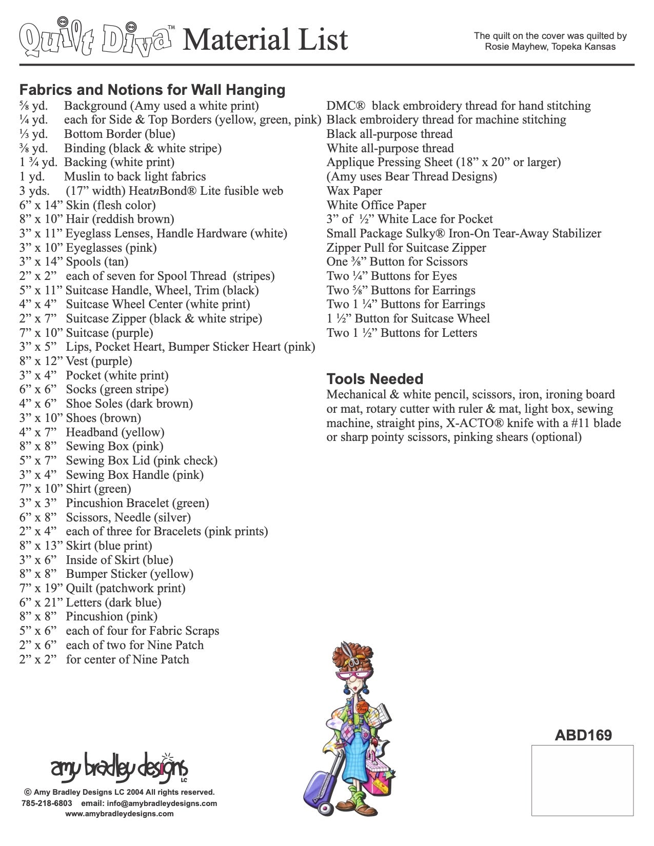 Are you a Quilt Diva?  Make this fun quilt for yourself or a friend and accessorize her with buttons, sequins, pins, and more.  Quilt Diva pattern includes full-size patterns, placement sheet and instructions to make the 24" x 49" wall hanging.  The 3" Pink Quilt Diva button is included.  The technique is fusible applique.