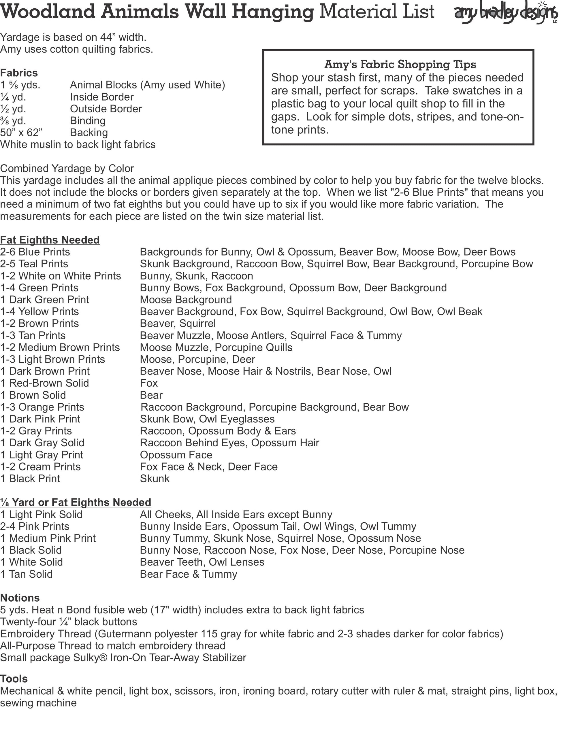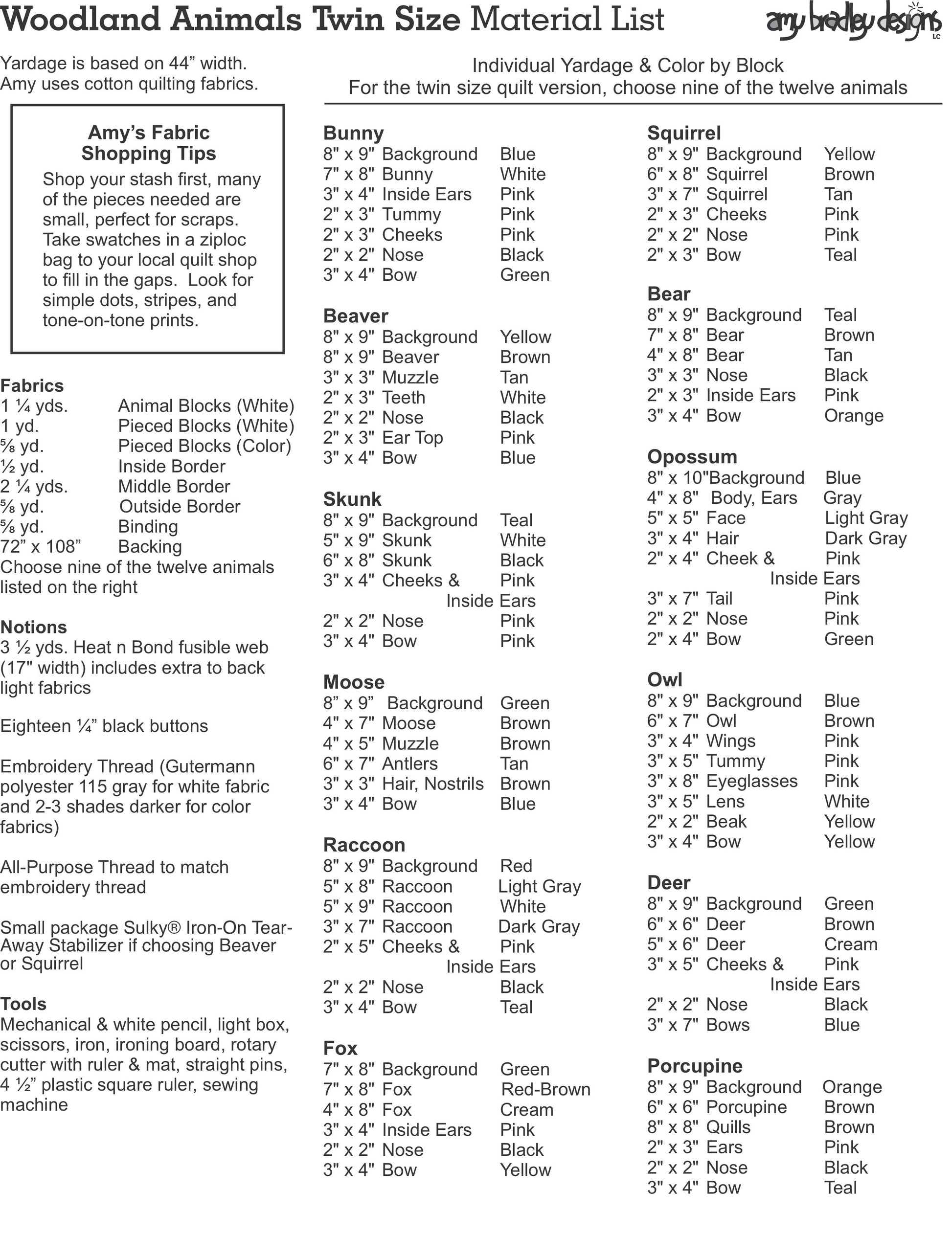 Woodland Animals quilt pattern includes full size patterns, full size placement sheets, and instructions to make a 42" x 54" wall hanging with twelve animal blocks and a 60 1/2" x 96 1/2" twin size quilt with nine animal blocks and nine pieced shoo-fly blocks. The technique to make the animal blocks is fusible applique. The block size is 12 1/2" x 12 1/2". Optional SVG files are included for use with electronic cutting machines.